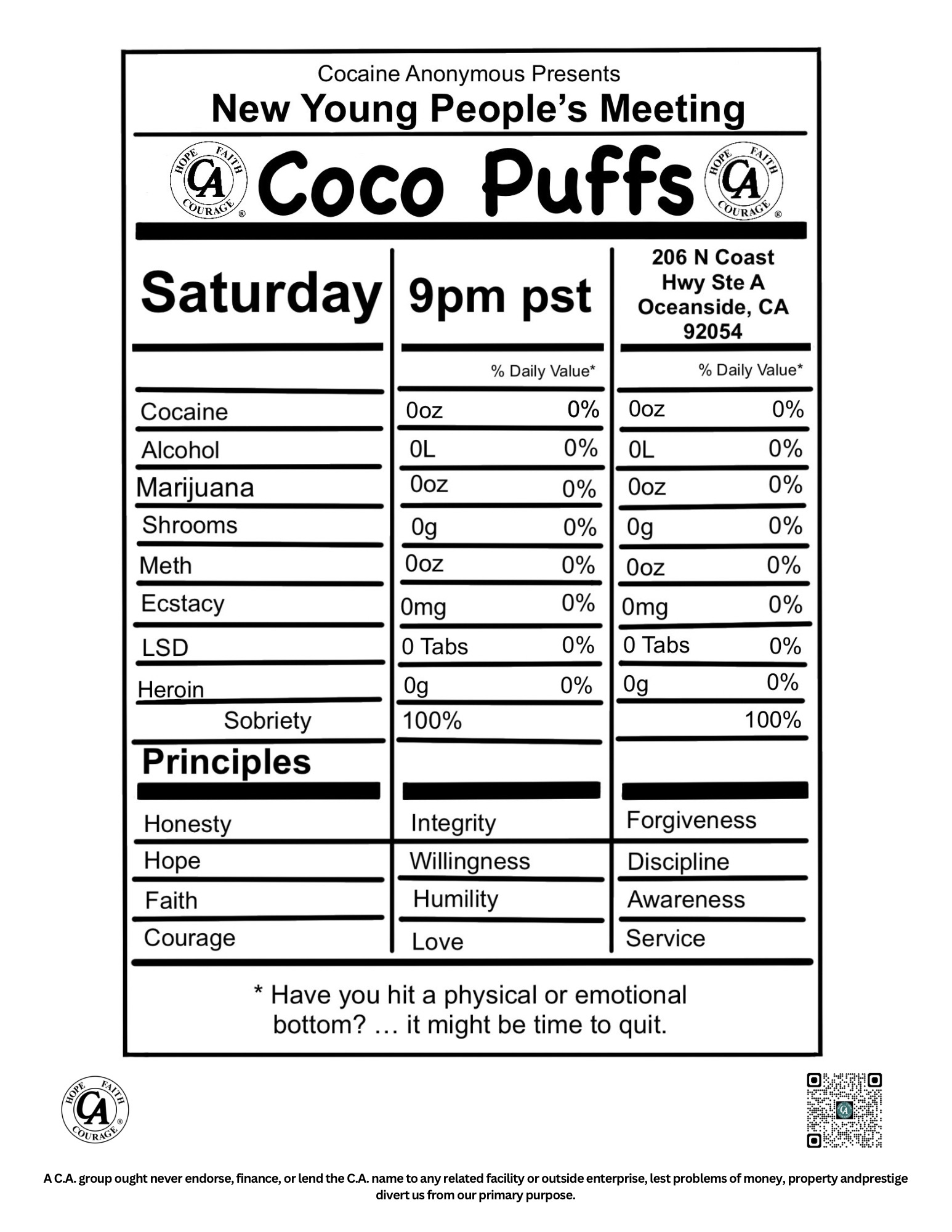 Our primary purpose is to stay free from cocaine and all other mind altering substances and to help others achieve the same freedom. We use the Twelve-Step recovery program because it has already been proven that the Twelve-Step recovery program works.